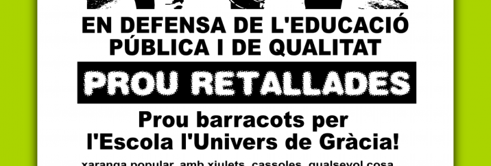Per això sortim al carrer: Dissabte, 30 d’abril a les 18h als barracots de l’Escola Univers a la Vila de Gràcia. Cercavila reivindicativa: “En defensa de l’educació pública i de qualitat. Prou retallades! Prou barracots per l’Escola l’Univers de Gràcia”