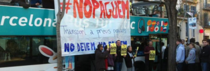Un grup d'unes 25 persones, promotores de la iniciativa 'No paguem', van ocupar el passat 5 de gener un bus turístic estacionat al Parc de la Sagrada Família –a la confluència dels carrers Sicília i Mallorca–, per exigir transports públics a preus populars. Com a protesta davant el nou augment de les tarifes dels transports gestionats per l'empresa TMB, les activistes van cridar a realitzar una jornada de desobediència, el dia 9 de gener, consistent en no pagar el bitllet corresponent. Sota la consigna 'organitzat i cola't', pretenen mobilitzar la ciutadania, especialment sectors vulnerables com les joves i aturades, perquè no permeti el que consideren 'un nou abús per a la classe treballadora dels Països Catalans'. La plataforma 'No paguem' va demanar també la readmissió del conductor d'autobusos de TMB acomiadat Andreu de Cabo.